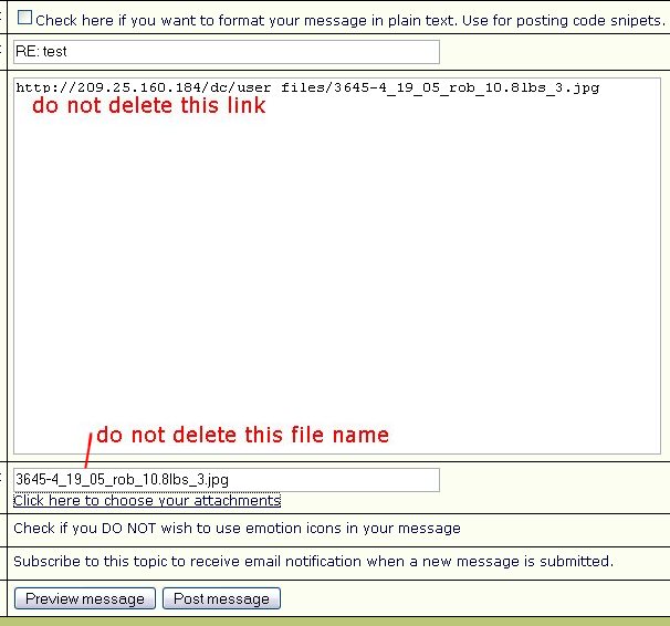 Now go back to the window where you are composing your message. You will see that a link to your picture has been automatically inserted in to your message. Do not delete this link! You will also see that there is now a file name in the Attachment section below your post. Do not delete this file name!