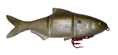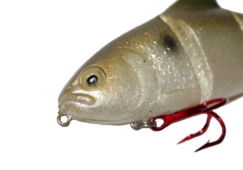 The Platinum Gizzard Shad showed up on the scene in early 2006. This 6" bait is available in two sink rates (fast and slow) and two colors (blue shad and green shad). The fast sink model weighs 1.5oz and slow sinker is just a little lighter. The lures come stock with the Castaic Treble Claw hook in red, and retail for around $14.